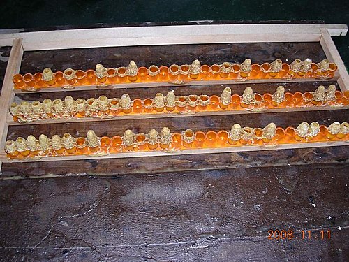 如果要培育新蜂王通常我都留座漂亮肥大封蓋的王台,然後移入培育的蜂箱,為防止原蜂王去破壞王台,我都會暫時將蜂王用王籠幽禁起來,等待新蜂王掀蓋羽化。