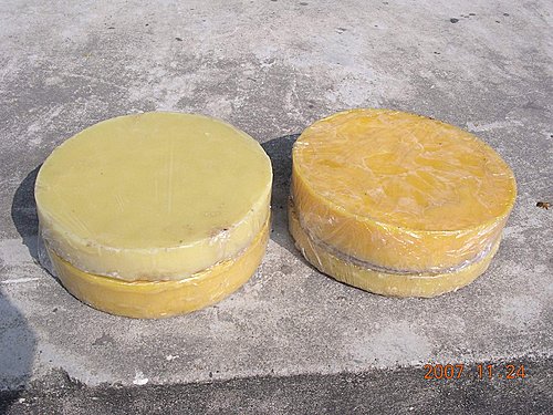 這是由巢箱割下的贅脾,收集起來熔成蠟塊。