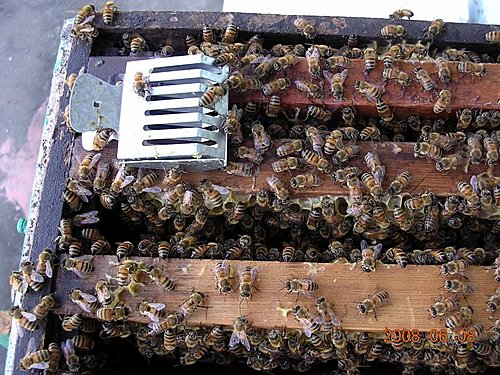 當蜂群失王時需補充蜂王或蜂王老化、產卵能力不佳、貯精量不足而產雄蜂卵時,都要進行換王,以延續該蜂群的生存。換王最直接方式是老蜂王剪翅,保留若干肥大王台使自然汰舊換新。再來就是由育王箱培育新蜂王後誘入新蜂王,首先將原群內的自然王台或急造王台除去,使工蜂容易接受新蜂王,如上圖關王約3天,,使用王籠時,王籠內應放置煉糖(蜜混合白砂糖)。經2-3天觀察,王籠周圍的工蜂數量不多,且對蜂王無敵意並在箱外餵飼蜂王時,才可悄悄放出,放出後20~30分鐘後沒有圍王現象才算接受。飛來蜜 發表在 痞客邦 留言(0) 人氣(183)
