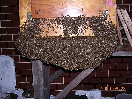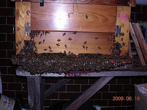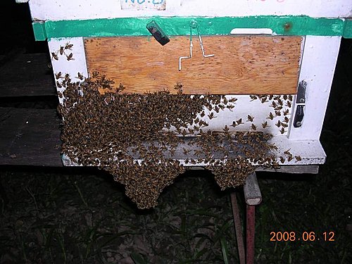 分蜂是蜜蜂自然繁衍的一種本能,古稱分封,發生分蜂時,原有蜂王連同半數的工蜂離巢,另建新巢,原有的蜂巢則留給新蜂王,形成另一群。台灣除了冬季低溫少分蜂外,其他季節都會發生分蜂現象,尤其春季主要採蜜期間,由於分蜂前,蜜蜂即停止各項生產工作,因此對於養蜂者,除非增加養蜂群數外,在生產期間都嚴防分蜂發生。上圖為分蜂前的夜晚,蜂群旺盛傍晚外勤風歸巢在外面形成蜂鬚,(蜜蜂結在一起很像鬍鬚),這群蜂選在黑色星期五上午10點,由老蜂王帶隊脫逃,先逃到樹上後當然又被我捉回來,未交配的新王就留在原巢。分蜂原因有二項假說,一為當蜂群繁殖量大增,群內呈擁擠現象,使蜂王分泌的蜂王質被稀釋或有些地方的工蜂無法感受到,終於促成蜜蜂築造王台,強迫蜂王在王台內產卵;另一假說為,蜂王已老化,所分泌的蜂王質減少,以致工蜂另築新王台。如形成如上圖的蜂鬚就很容易造王台,很容易分出另一族群,如不想分群起碼一星期檢查一次並移除王台,否則保證2星期過後的晴天,約上午10點過後分蜂。飛來蜜 發表在 痞客邦 留言(0) 人氣(123)