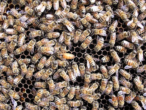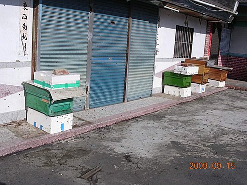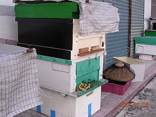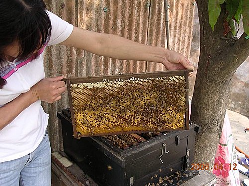 ↑ 雙王繼箱是突破台灣傳統養蜂的一項新技術,此方式在國外普遍被採用,而台灣一線蜂農為何少用?除最主要的搬運不便外,就是台灣的採蜜習慣是集中在春天的龍眼開花蜜期,蜂農必須逐花搬遷蜂箱,為了搶收龍眼蜜必須3-4天搖一次蜜,此時的蜂巢是無王群或者是蜂王被幽禁停止產卵的,因為這樣工蜂無幼子供照顧,可多數外出採蜜,這樣才可在短短龍眼蜜期採最多蜜。